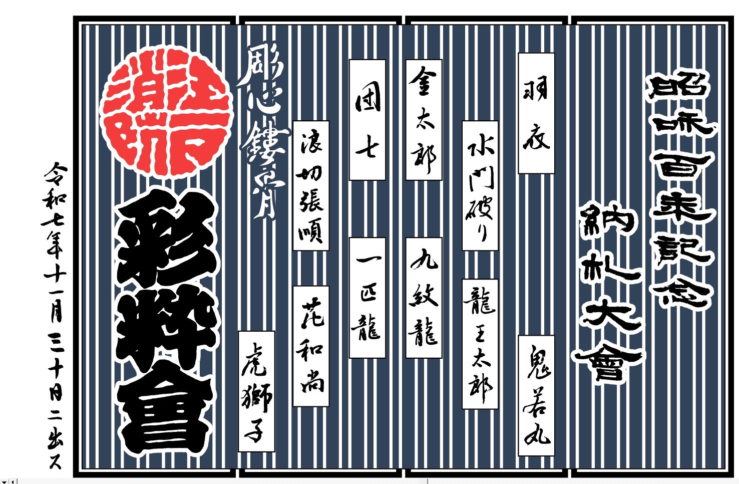 11月の予定にもありますように、平成7年11月30日(日)大本山増上寺光摂殿(東京都港区芝公園四丁目)にて「昭和百年記念 納札大會」が開催されます。